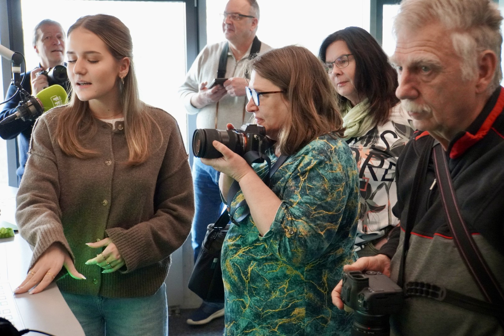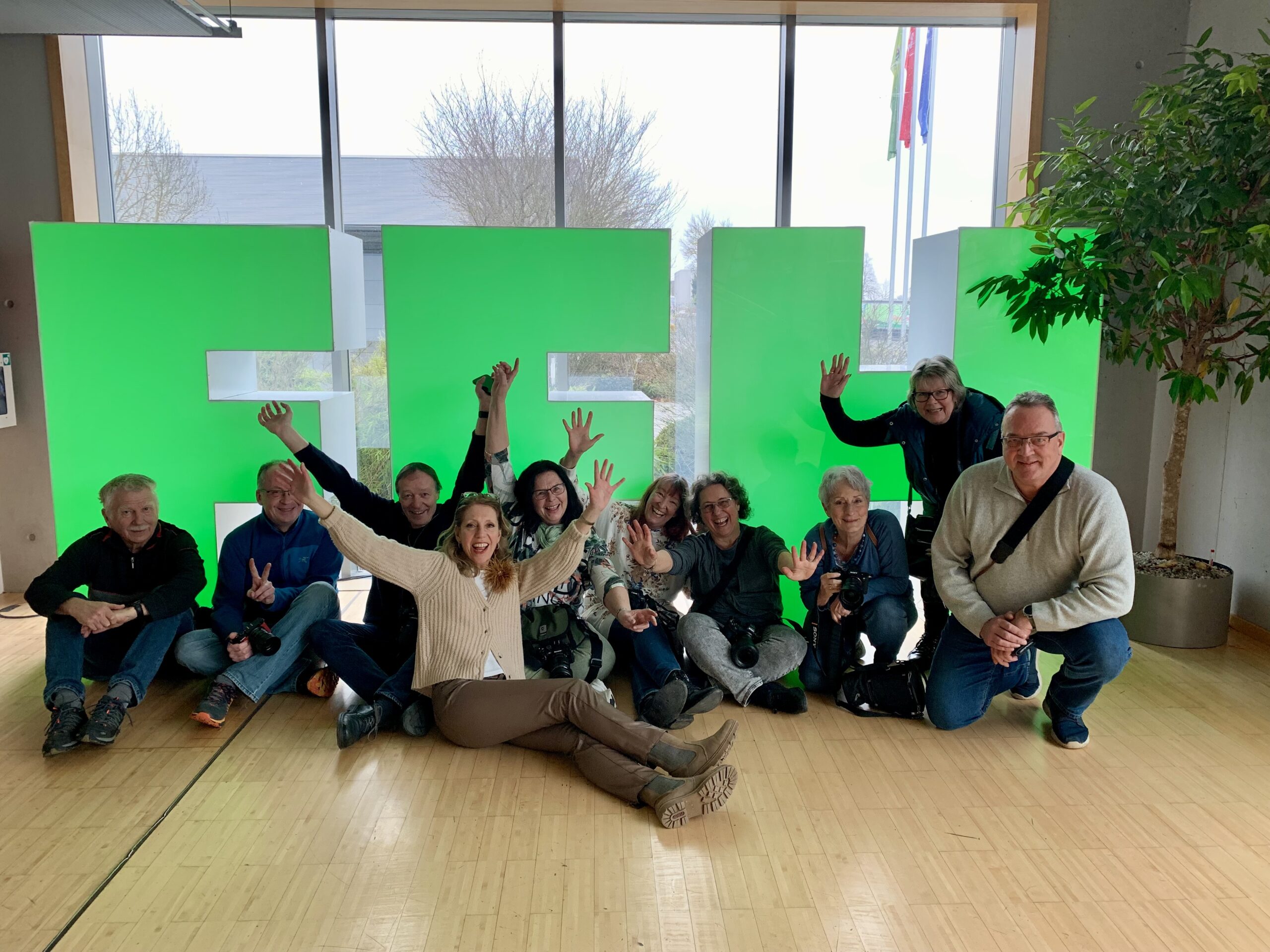 Schon am Eingang sorgte die sympathische junge Dame am Empfang für den perfekten Start: Vor dem markanten FFH-Schriftzug mit den grünen Leuchtbuchstaben entstanden unsere Gruppenfotos.