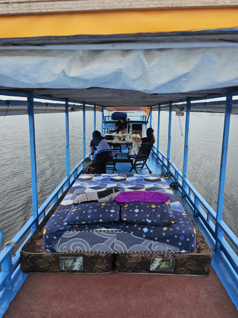 Geschlafen wird auf Matratzen auf Deck, die abends in Betten verwandelt werden mit Moskitonetz. Daneben gibt es noch einen Tisch zum Essen, 2 Liegestühle und ein einfaches Bad. Gekocht wird in der kleinen Kombüse für uns und das sehr lecker.