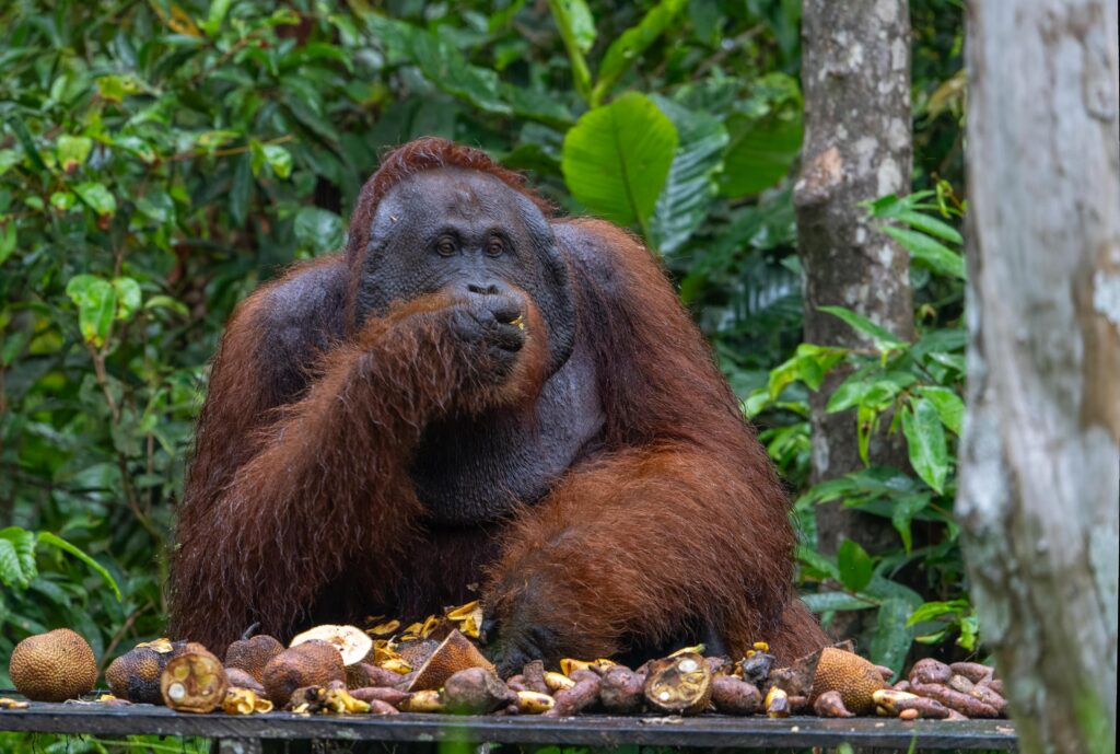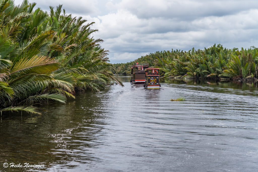 Tagsüber schippern wir über den Fluss Sekonyer und können immer wieder Tiere beobachten. Viele Nasenaffen die am Morgen und Nachmittag von Baum zu Baum hüpfen sowie einige Makaken und viele Vögel. Tatsächlich leben Nasenaffen nur auf Borneo und sind einer der Gründe für mich hierher zu kommen. Insgesamt halten wir an 3 Camps, in denen auf Plattformen Futter für die ausgewilderten Orang-Utans abgelegt wird. Allerdings sehen wir nur an der 1. Plattform welche, die anderen beiden besuchen wir „umsonst“. So schade es für mich ist, so zeigt es doch, dass die Orang-Utans nur dann zu den Menschen kommen, wenn Sie nicht genug Futter im Dschungel finden. Gerade ist aber Fruitseason, sprich es gibt so viele reife Früchte, das sie auf das zusätzliche Futter nicht angewiesen sind.