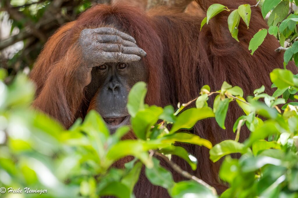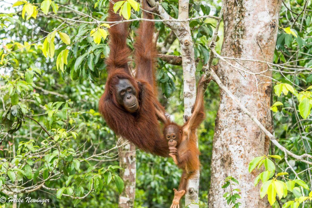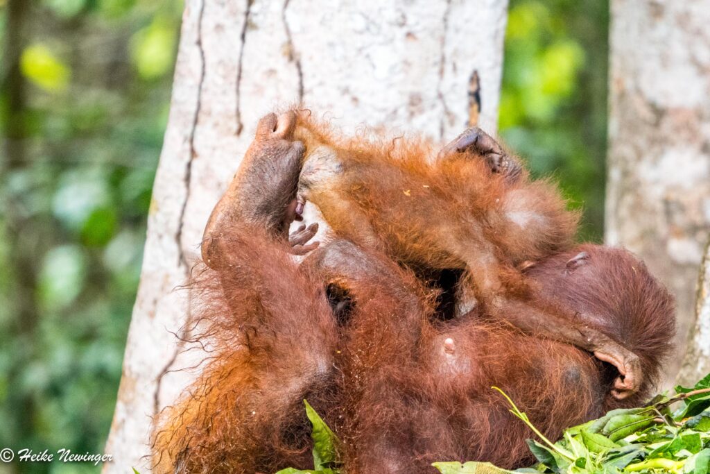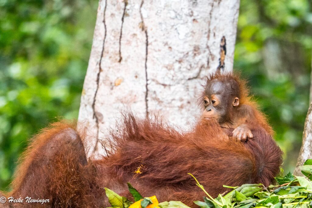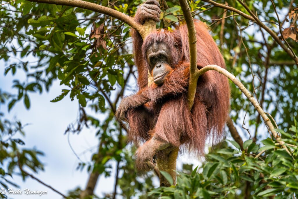 Auf den Inseln leben Orang-Utans, die im letzten Stadium der Auswilderung sind. Die Inseln werden von Menschen nur zum Bringen und Abholen von Orang-Utans betreten, ansonsten leben Sie hier alleine. Viele Touristen kommen ebenfalls nicht her, ich bin heute der einzige Gast. Mit einem kleinen Boot umrunden wir die Inseln und ich habe so viel Glück. Insgesamt sehe ich 10 ausgewachsene Waldmenschen und 2 Babys. Eigentlich sind professionelle Kameras verboten, aber da wir ohne Ranger unterwegs sind, packe ich die Kamera natürlich aus.