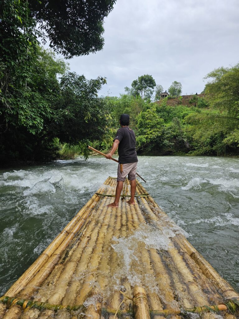 Am Nachmittag geht es fast 3 Stunden mit einem Floss den Fluss herunter, Bamboorafting. Die Indonesier lieben es und die Landschaft ist wirklich großartig.