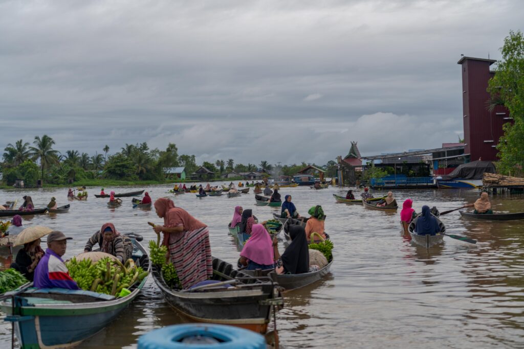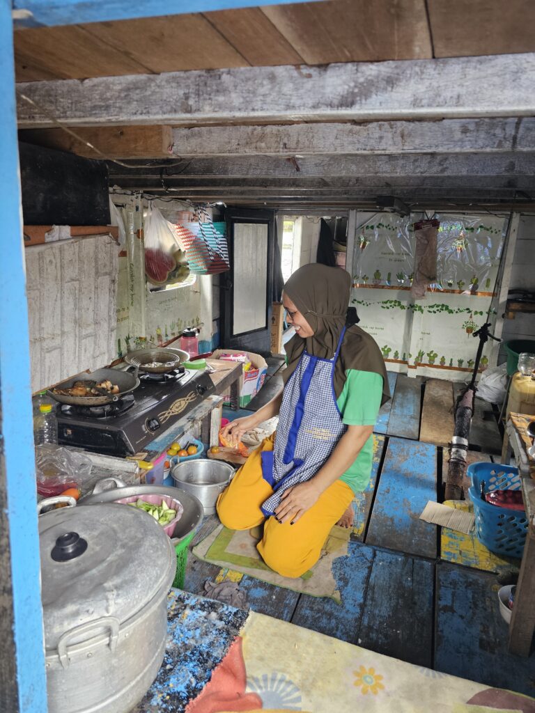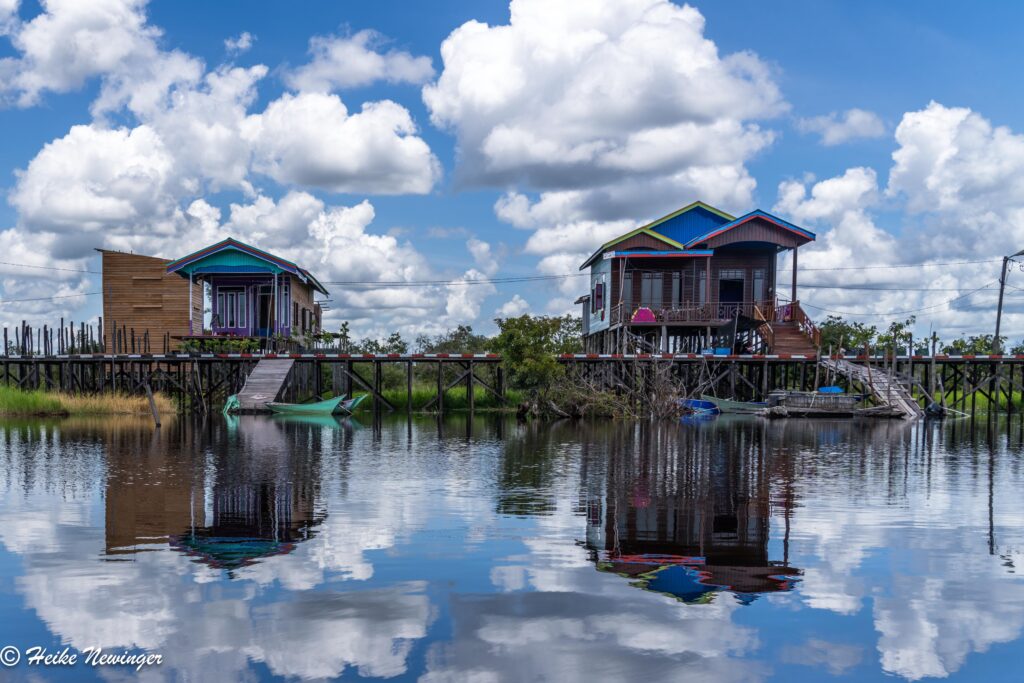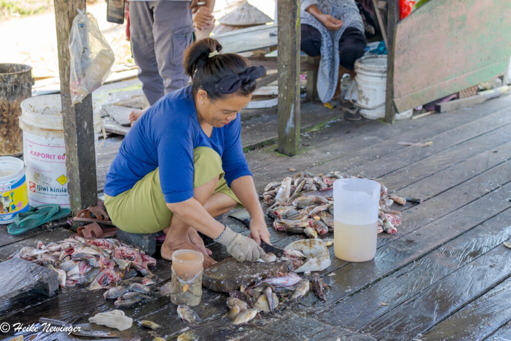 Diese Nacht bleiben wir in einem kleinen Guesthouse in Murai Muntai, aber am frühen Morgen geht es mit dem Boot weiter über den Mahakam Fluss und einige Nebenarme. Wir erkunden kleine traditionelle Dörfer und ich habe die Möglichkeit viel von dem Leben der Menschen zu lernen. Ein sehr einfaches, aber fröhliches Leben. Übernachtet wird die kommenden Nächte in einem traditionellen Langhaus der Dajak. 2 Frauen, die hier wohnen, bereiten abends das Essen für uns vor, mit Zutaten die wir tagsüber auf kleinen Märkten erstanden haben.