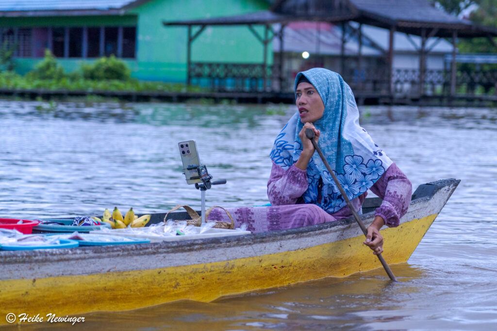 Hier fahren die Frauen mit ihren kleinen Kanus den Fluss hoch, um dann flussabwärts treibend ihre Waren in den Dörfern zu verkaufen, überwiegend Obst und Gemüse. Die Attraktion bin allerdings dann doch eher wieder ich. Eine jüngere Frau, die Obst verkauft, hat tatsächlich ein Handy auf dem Stativ im Boot stehen und macht einen Livestream für ihre Follower, und natürlich darf ich heute als Gast nicht fehlen.