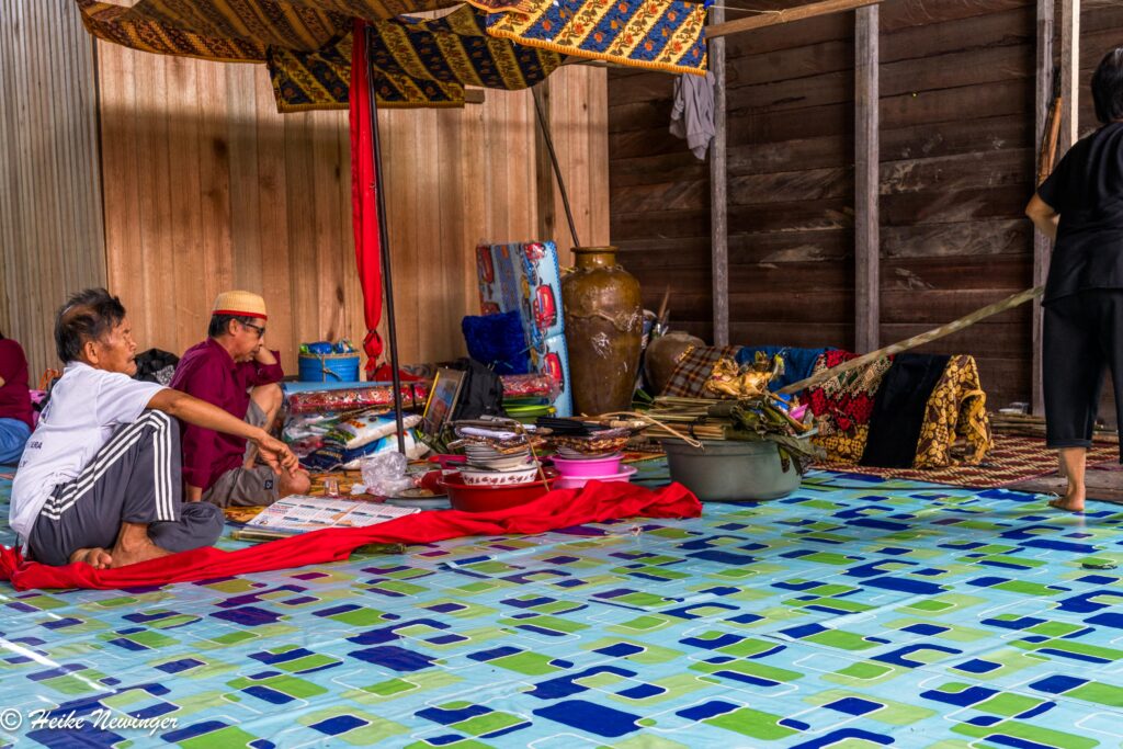 In der Nähe findet gerade eine Dajak Zeremonie statt, um die Dörfer auch das kommende Jahr vor bösen Geistern zu schützen. Leider ist noch nicht genug Geld zusammengekommen, so das ich den Höhepunkt leider nicht mehr erlebe. Um Geld zu sammeln, wird jeden Abend in Zelten um Geld gespielt. Ob Karten oder Würfelspiele – alles ist erlaubt außer hier zu fotografieren, aber mitspielen dürfen wir auch wenn von uns keiner die Regeln versteht. Am Wochenende findet ein großer Hahnenkampf statt – eine blutige Angelegenheit. Wir sind willkommen und dürfen zusehen, was wir allerdings nicht lange tun.