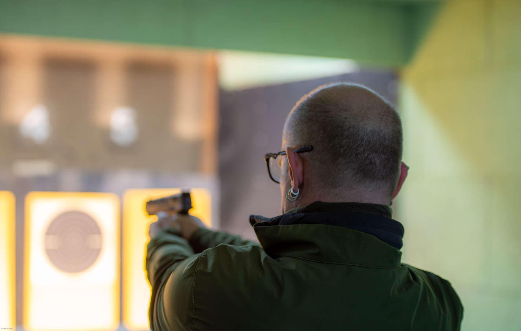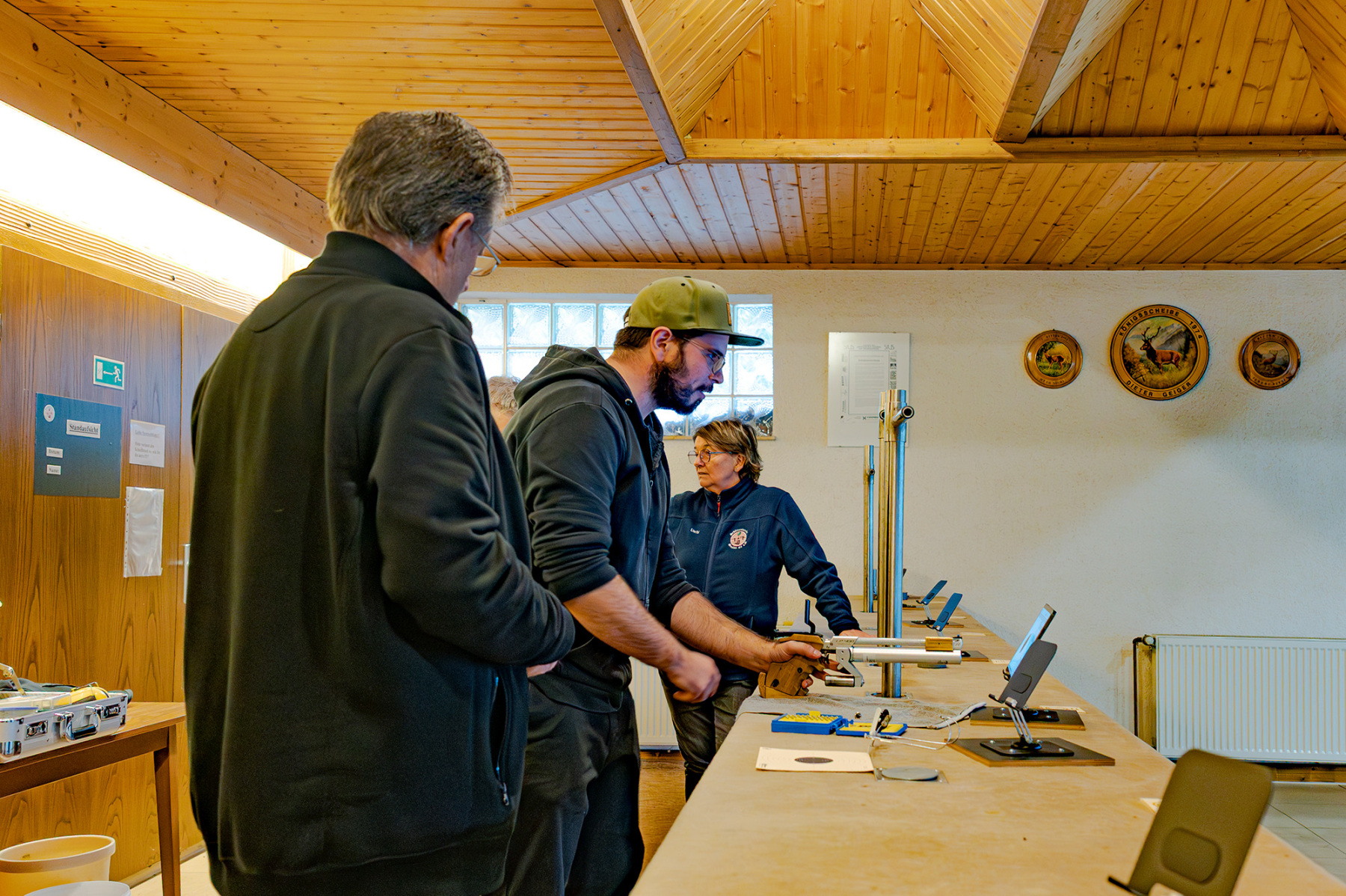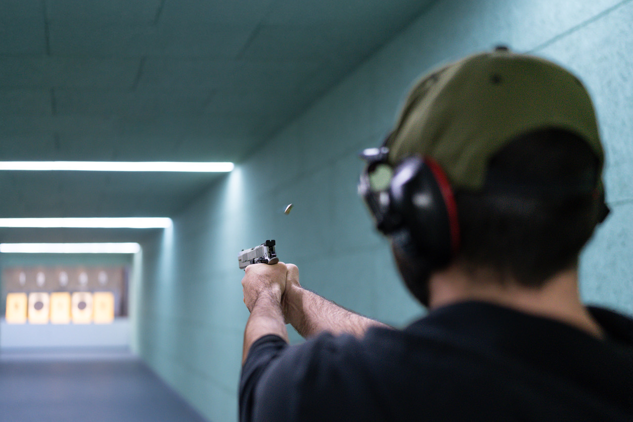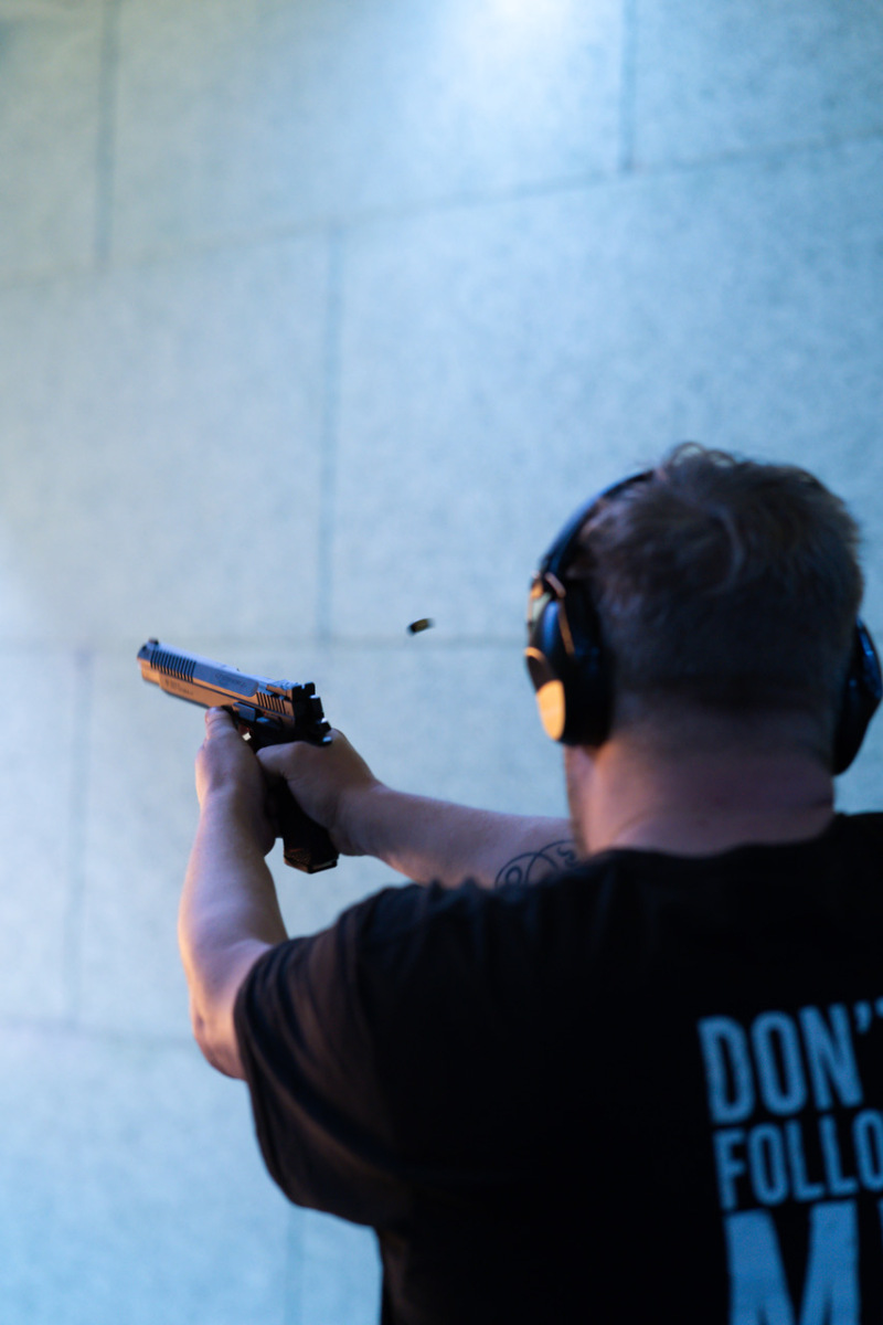 Unter Aufsicht äußerst sympathischer und erfahrener Schütz:innen testeten wir an drei unterschiedlichen Ständen eine breite Palette an Waffen: vom Luftgewehr und der Luftpistole bis hin zu den größeren Kalibern .223 und 9 mm, als Kurz- wie auch als Langwaffe. Für absolute Anfänger schlugen wir uns dabei auf den unterschiedlichen Distanzen überraschend gut: enge Streukreise, erste Zehner und viele Treffer im Schwarzen.