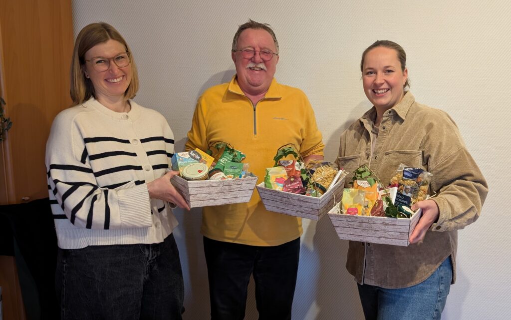 Lena Exner (links) und Rachel Hoffmann vom Kommunalen Integrationsmanagement für Teilhabe und Vielfalt der Stadt Obertshausen überreichten Detlef Penzel, stellvertretend für Pixelspaß Rhein-Main, ein Dankeschön fürs fotografische festhalten der Veranstaltung.